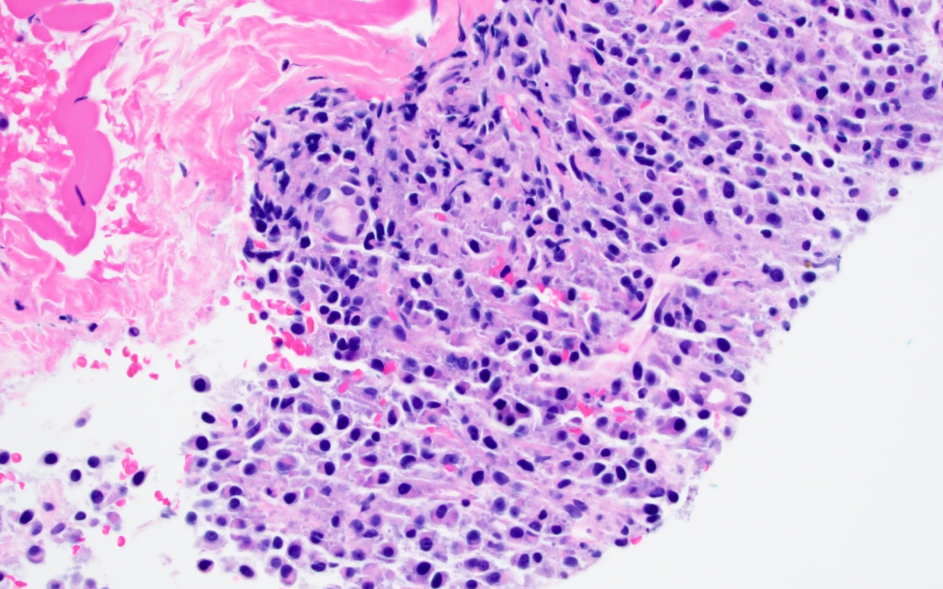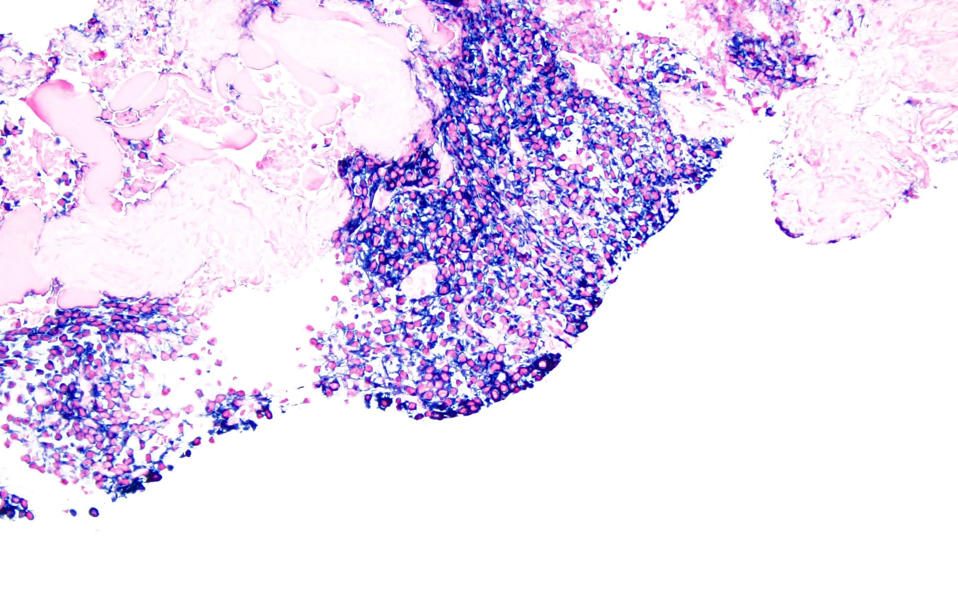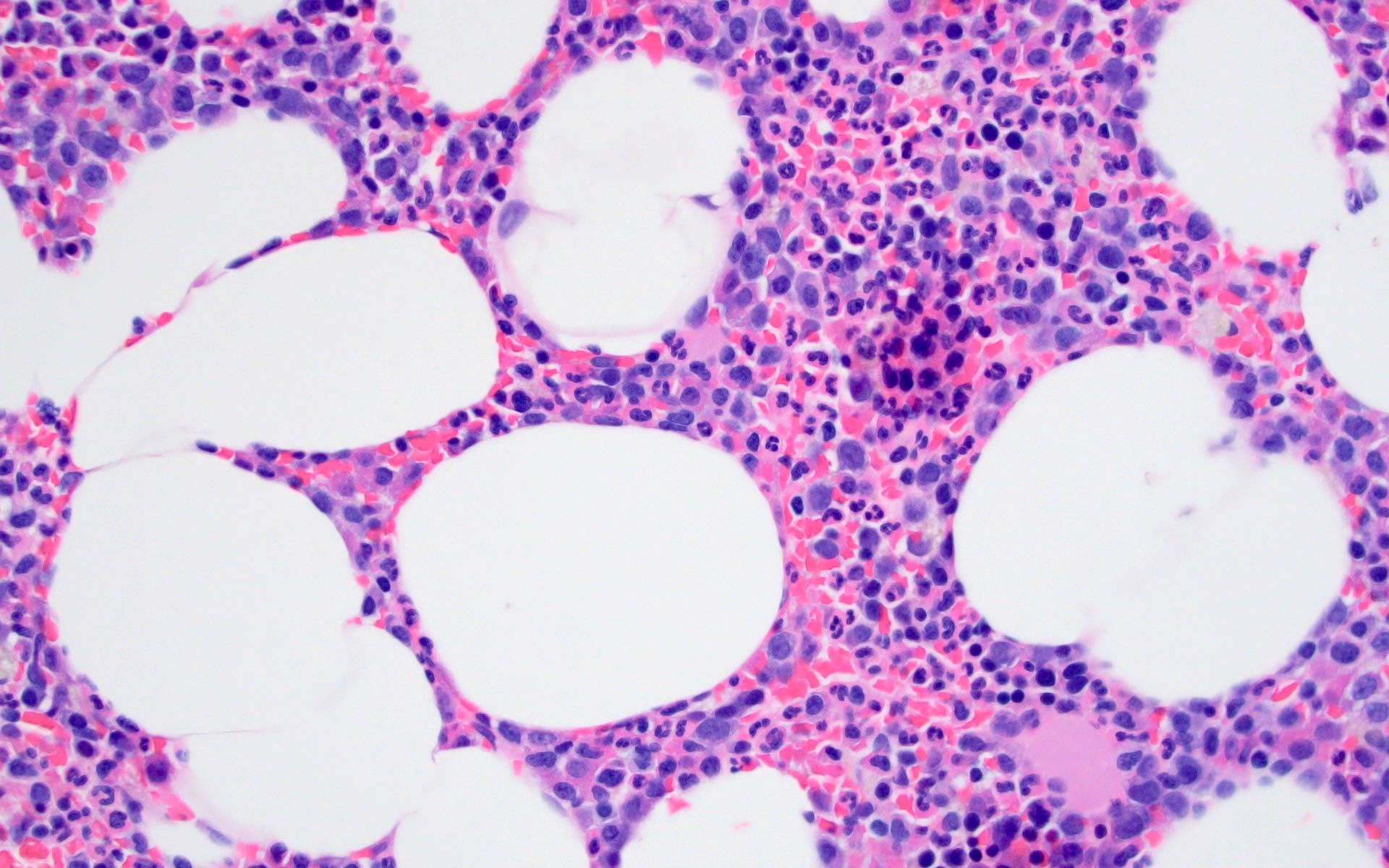 - Increased plasma cells with variable morphology, including small unremarkable plasma cells to atypical plasma cells (prominent nucleoli, plasmablastic / anaplastic morphology)