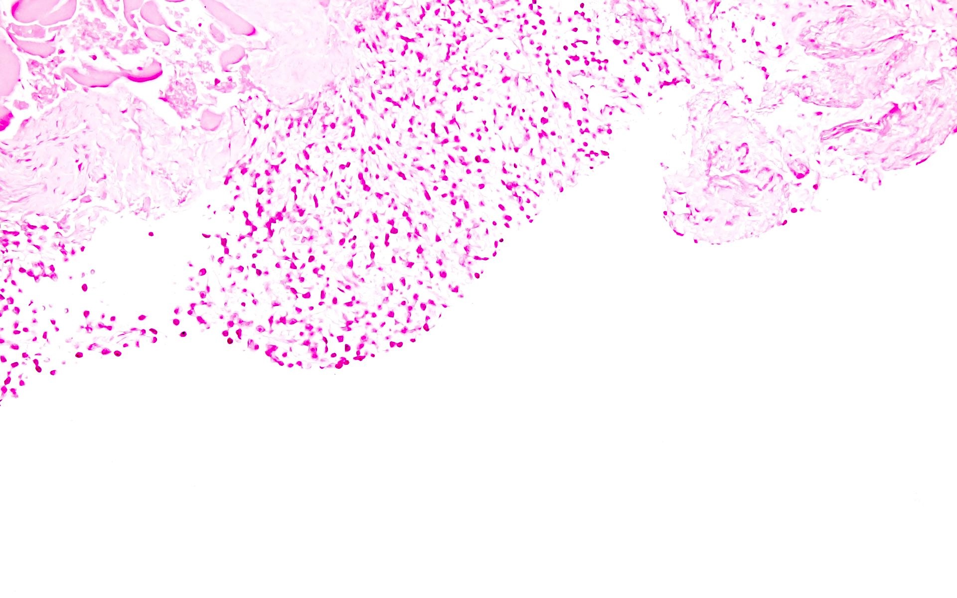 - Comment: The biopsy shows sheets of small plasma cells which are lambda restricted based on kappa / lambda in situ hybridization studies. EBER ISH is negative. Ki67 shows low proliferative index (< 5%). Clinical correlation with serology, imaging and bone marrow biopsy is suggested.