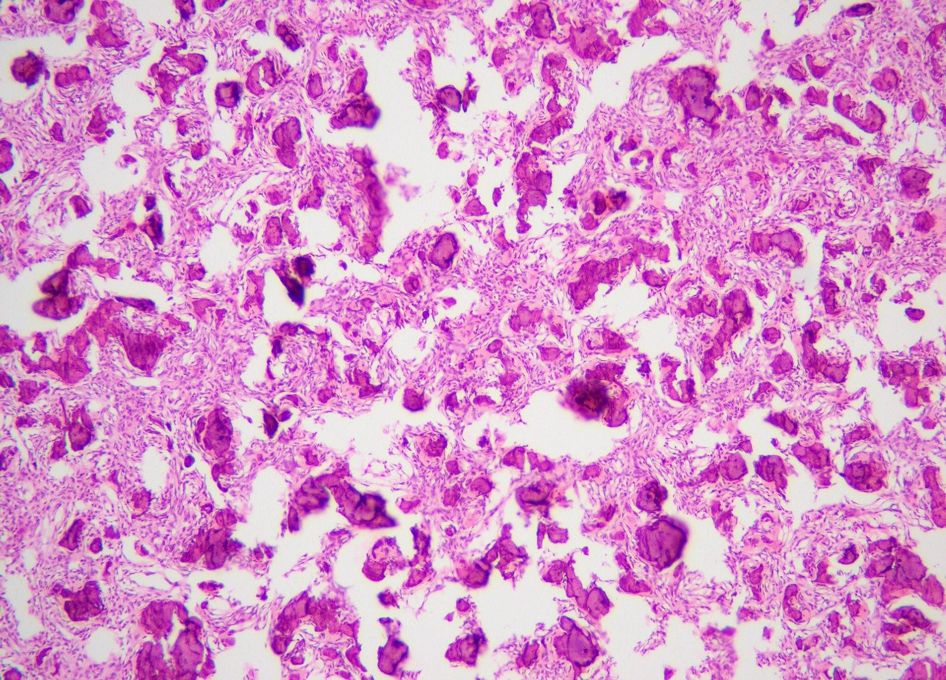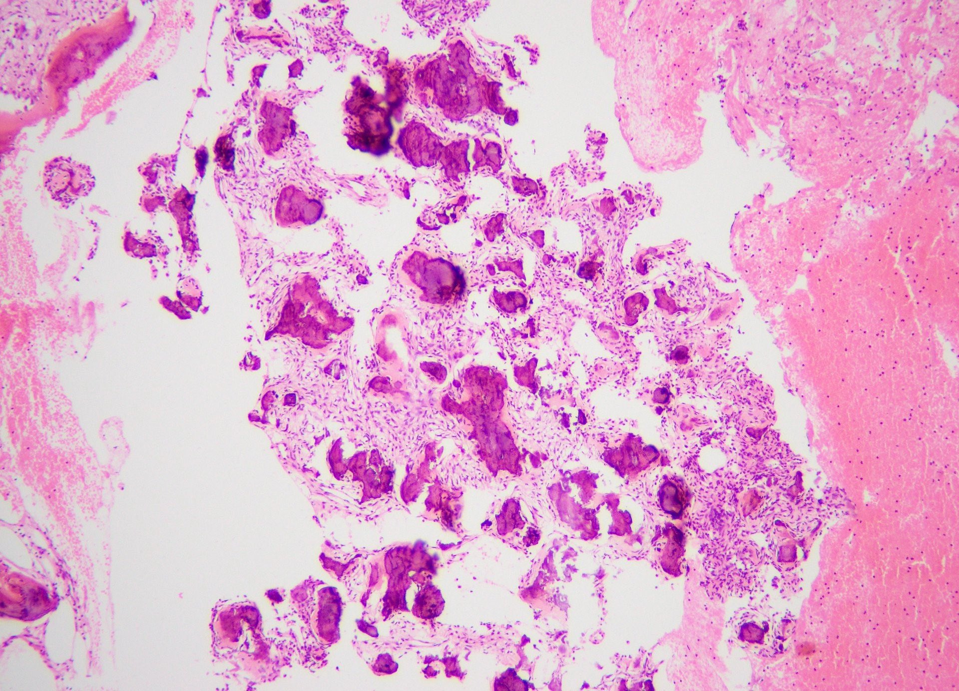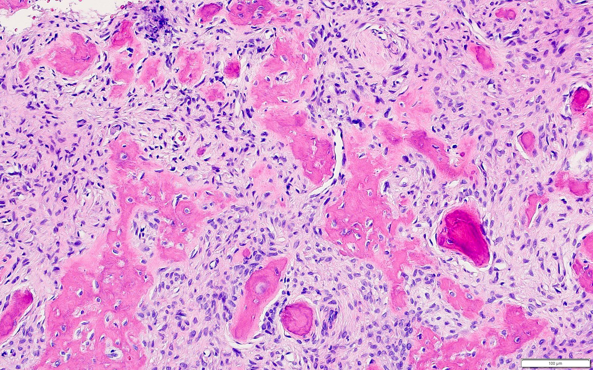 - Woven to lamellar bone, osteoid and dense acellular or paucicellular basophilic rounded cementum-like calcifications may all be present (Head Neck Pathol 2020;14:70)