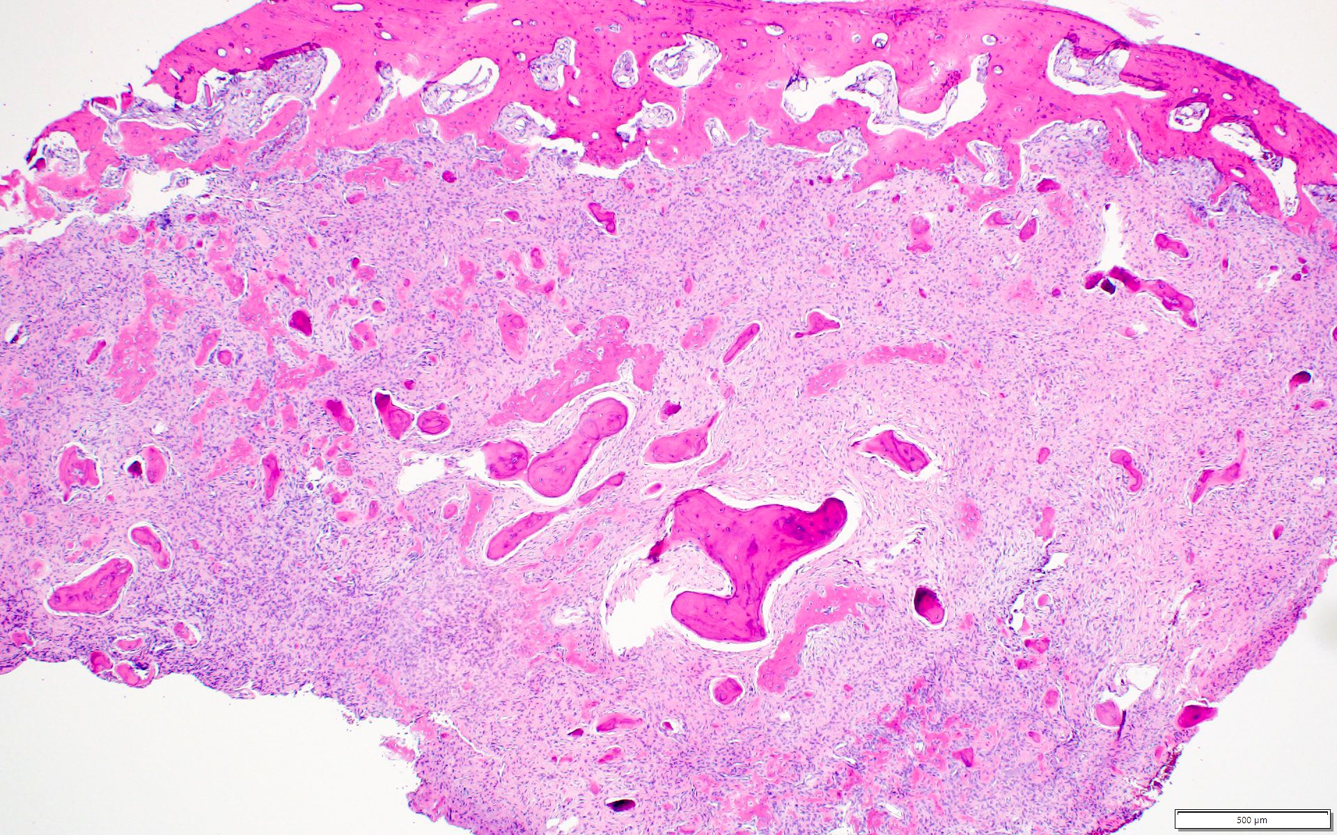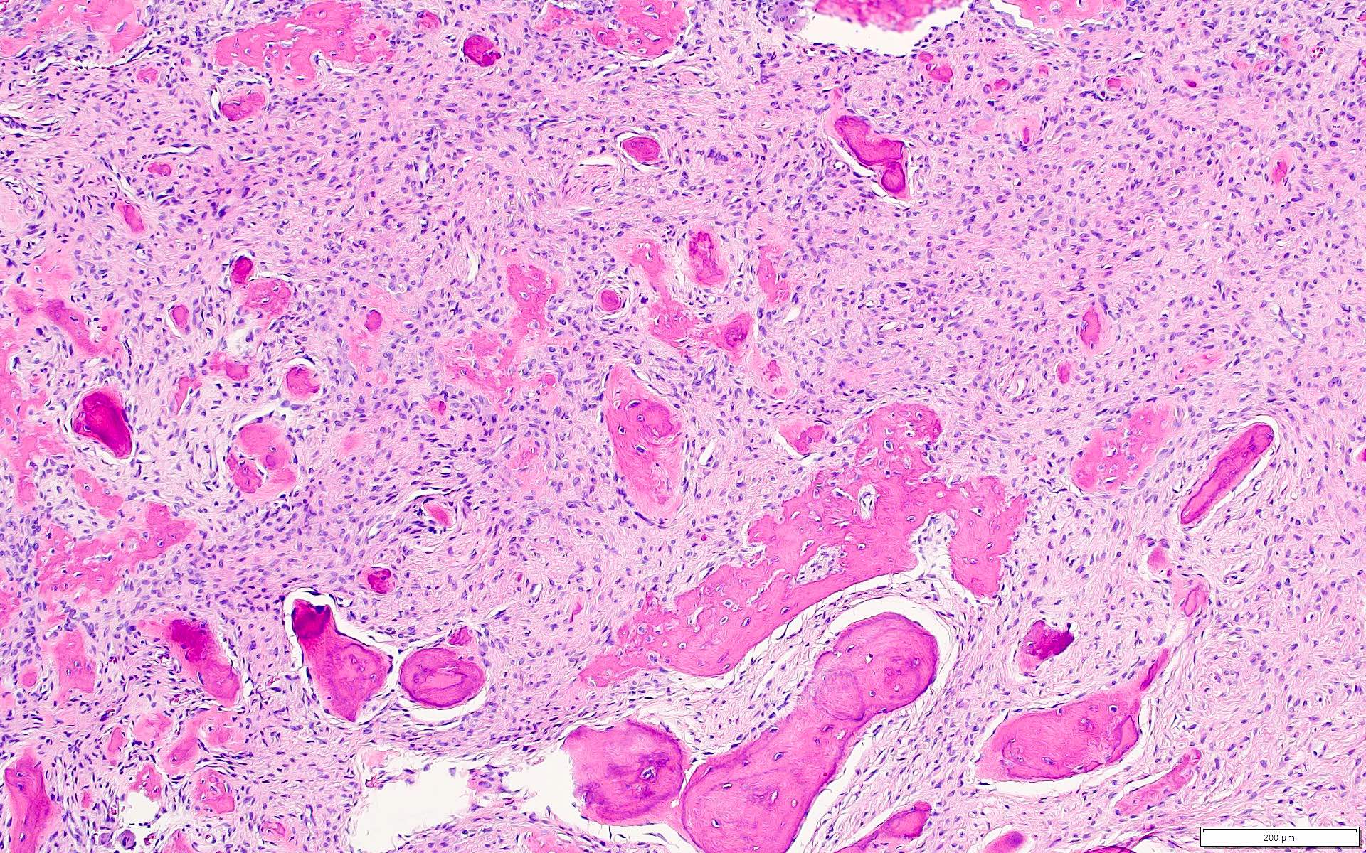 - Lesion is composed of haphazard mineralized trabeculae of bone showing prominent osteoblastic rimming, lying in cellular fibrous stroma