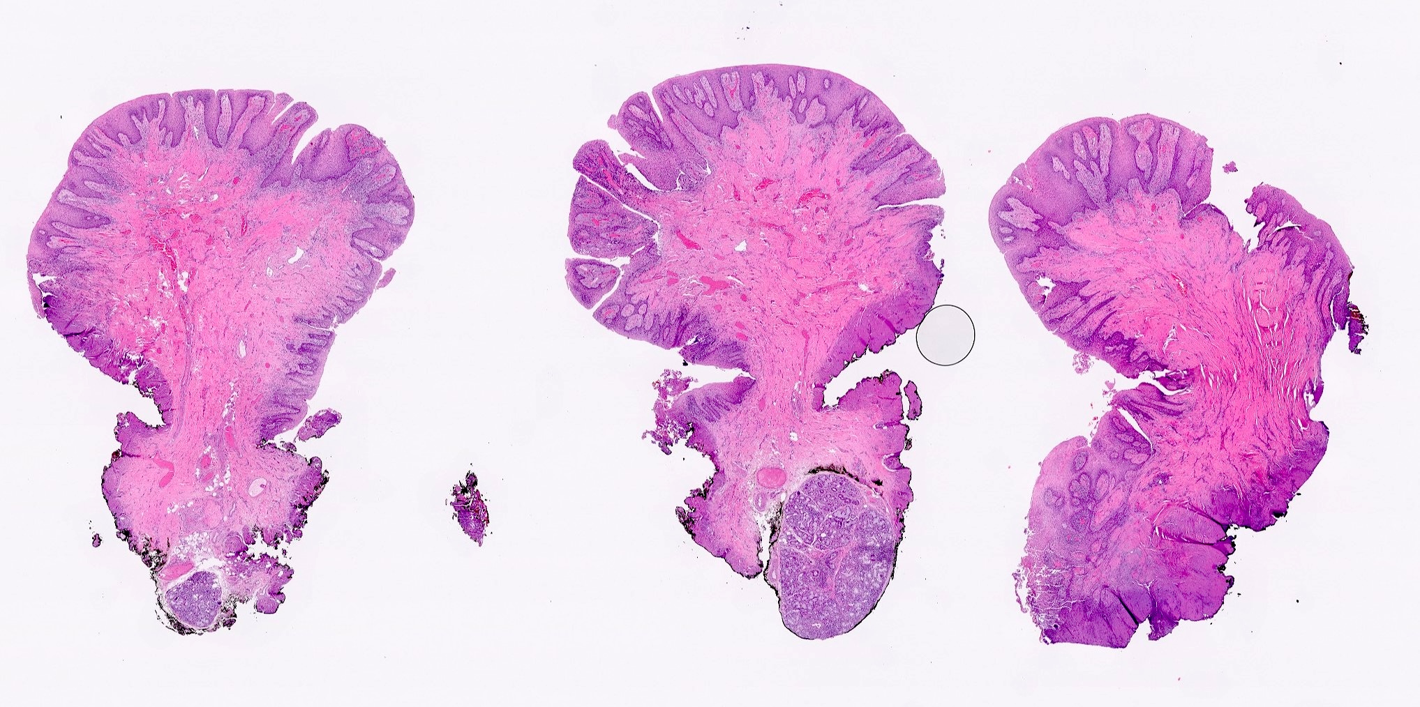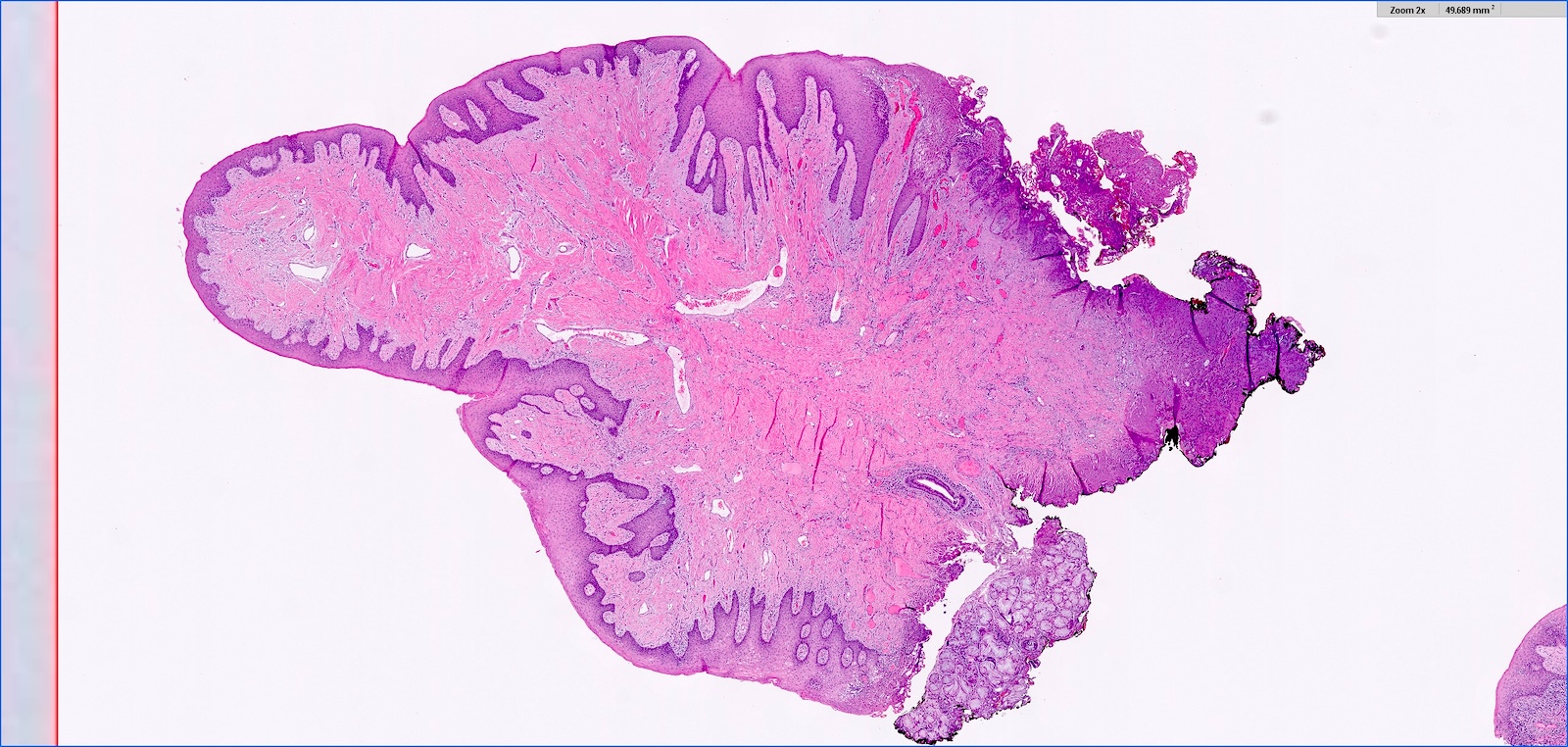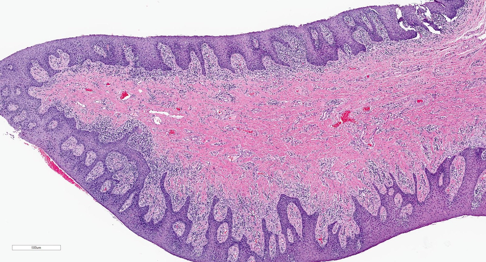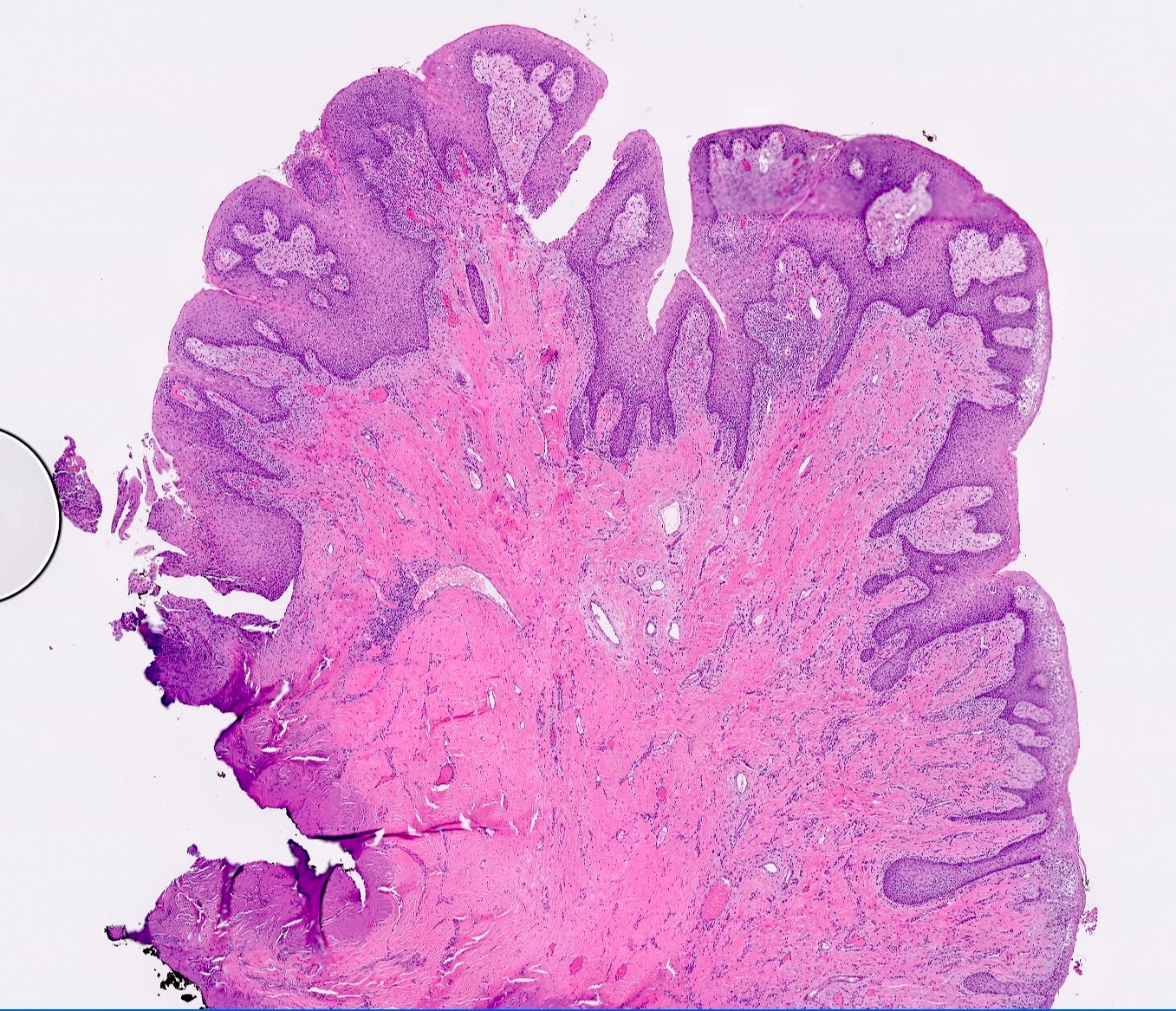 - Histologically is composed of squamous mucosa overlying a dense collagen proliferation with focal chronic inflammation