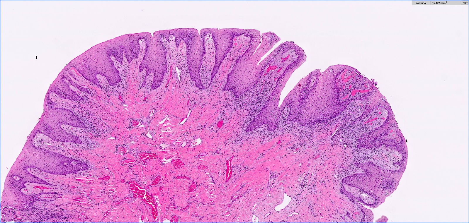 - Hyperplastic keratinized squamous mucosa overlying dense nodular connective tissue and variable inflammatory infiltrate (Acta Histochem 2016;118:451, Head Neck Pathol 2019;13:103)