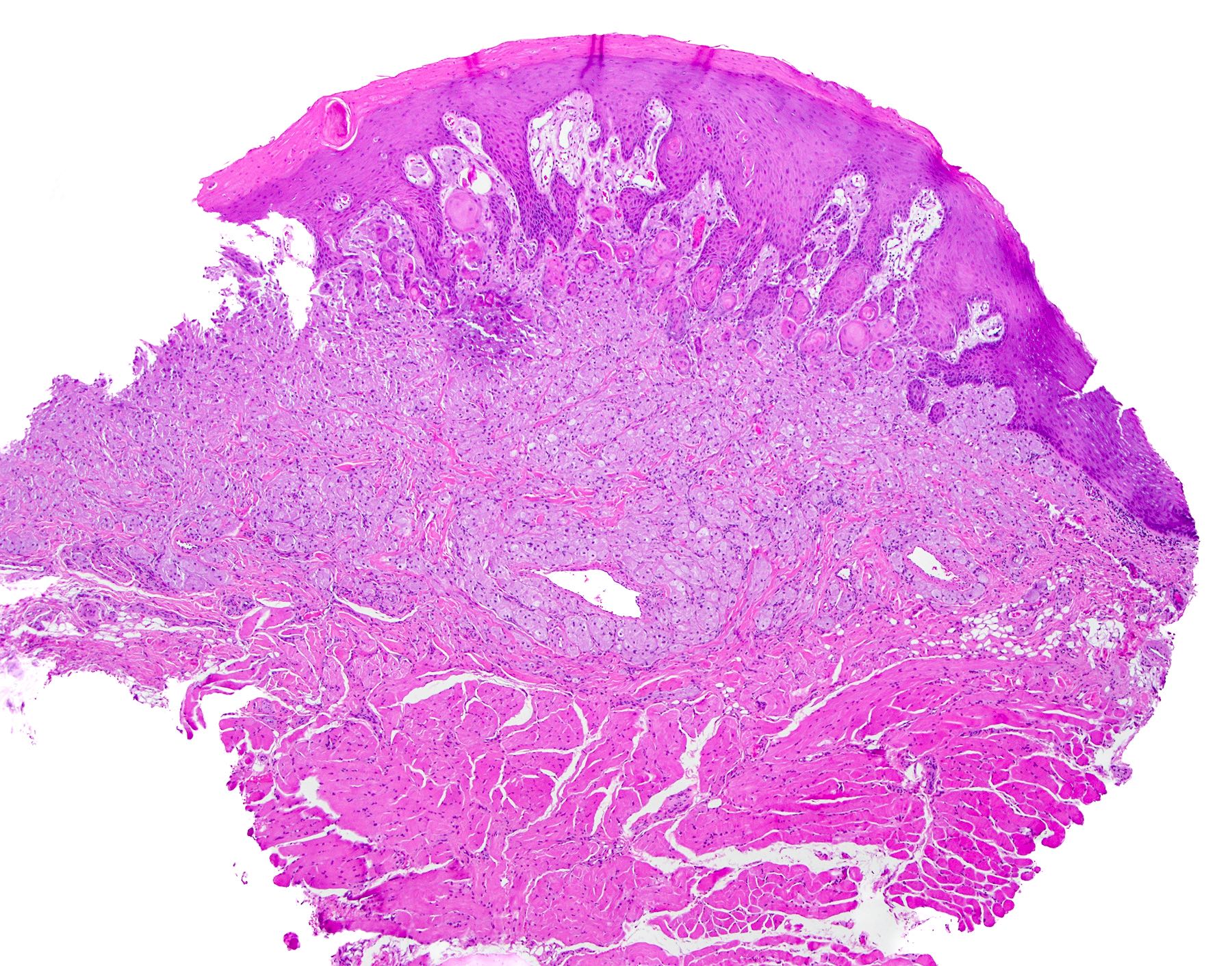 - Depends on the underlying diagnosis (e.g., granular cell tumor, blastomycosis, etc.) but in general, thickening of the epithelium is noted
