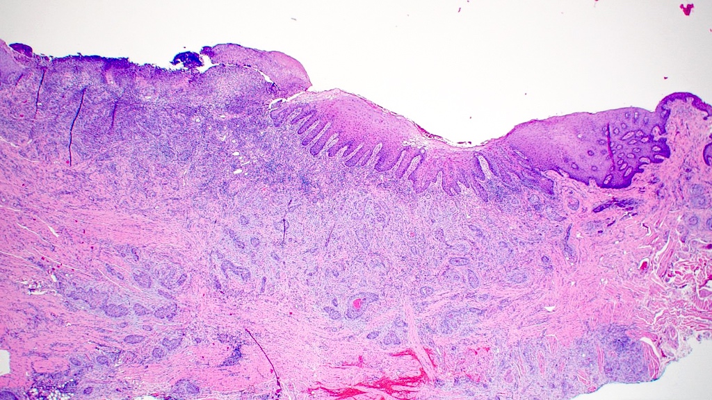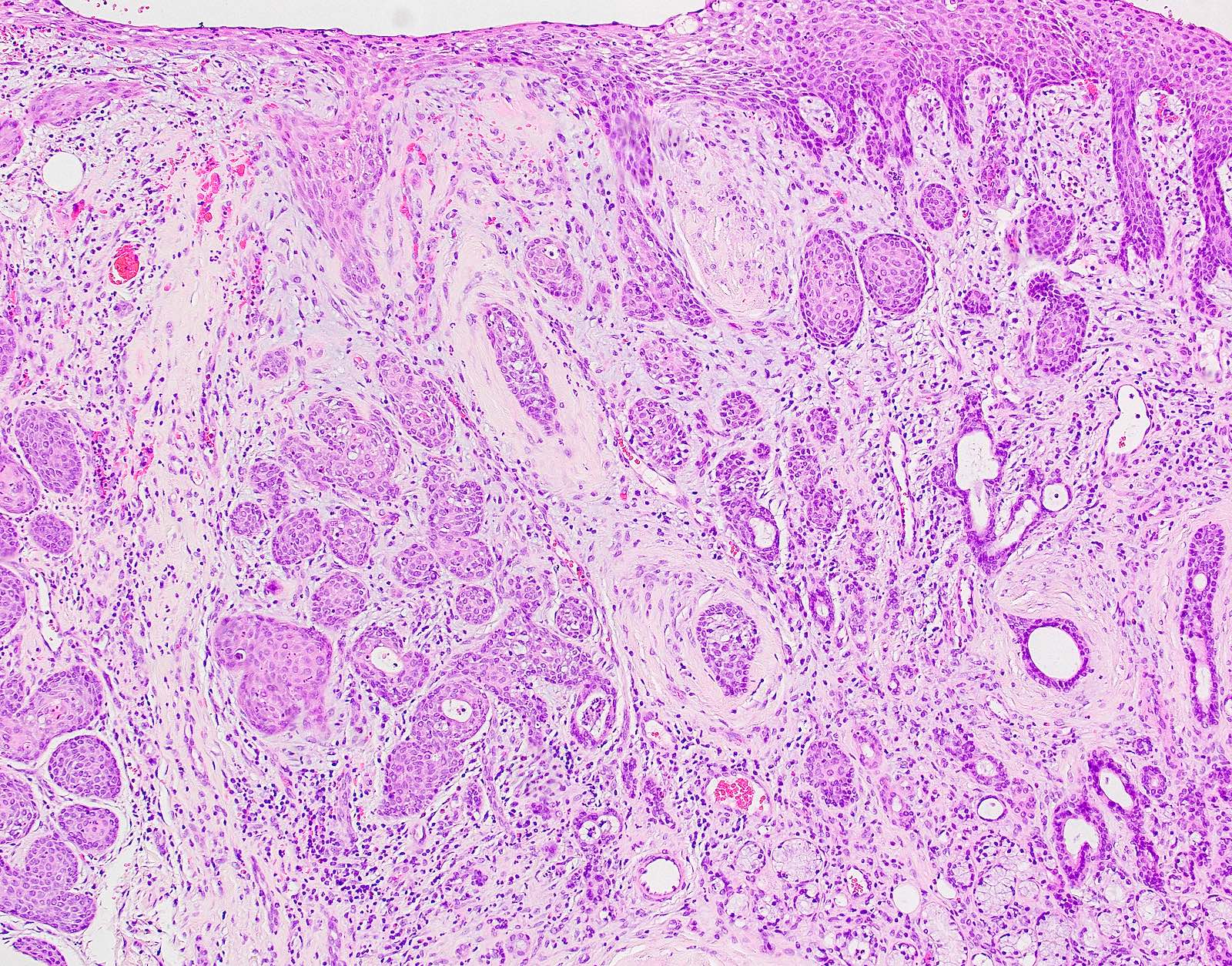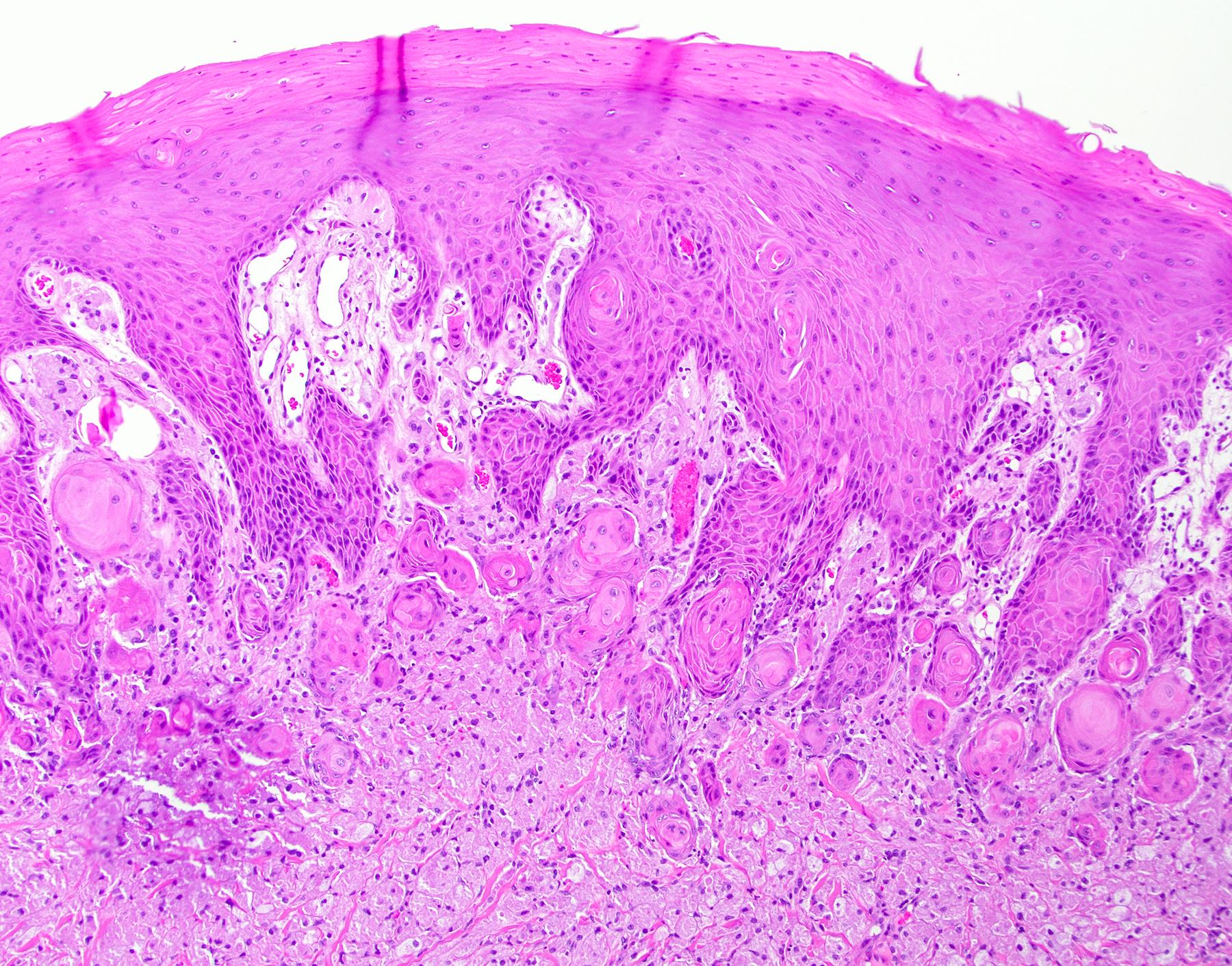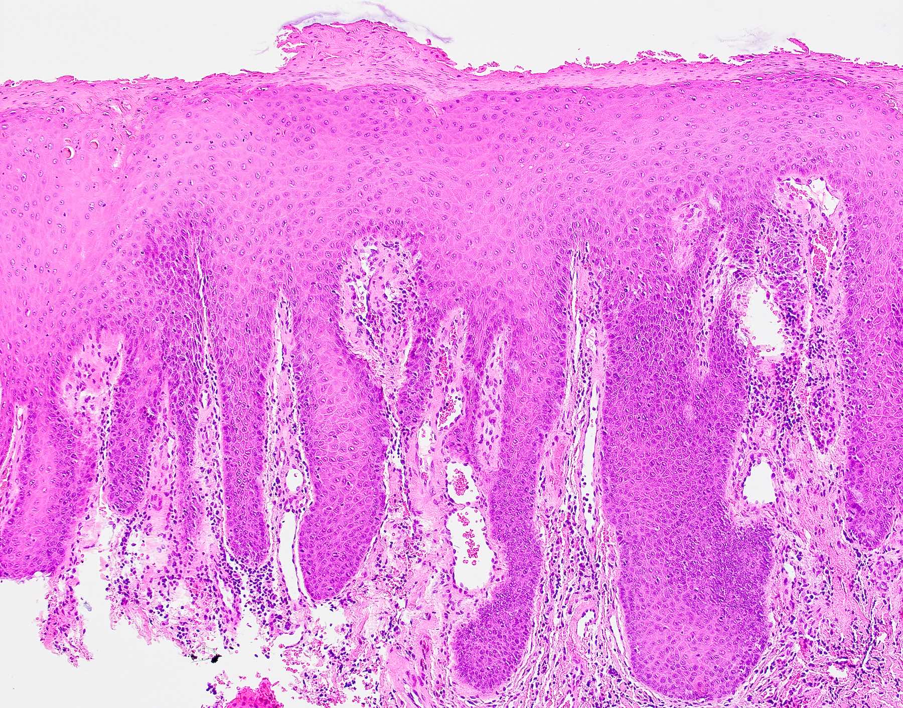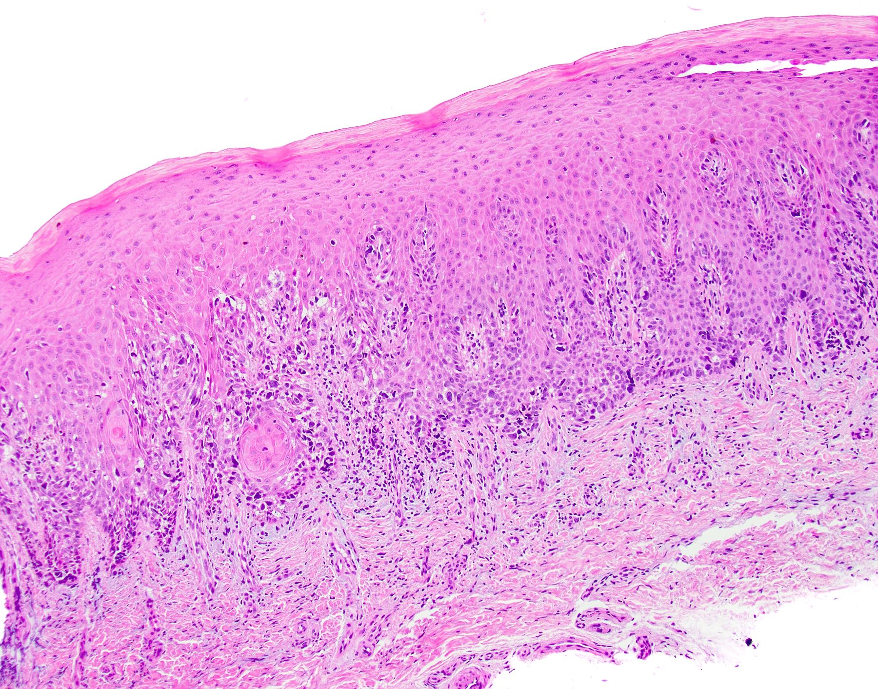 Definition / general | Essential features | Terminology | Sites | Pathophysiology | Etiology | Clinical features | Diagnosis | Prognostic factors | Case reports | Treatment | Clinical images | Gross description | Microscopic (histologic) description | Microscopic (histologic) images | Virtual slides | Positive stains | Videos | Sample pathology report | Differential diagnosis | Practice question #1 | Practice answer #1 | Practice question #2 | Practice answer #2 | Practice question #3 | Practice answer #3Cite this page: Smith MH. Pseudoepitheliomatous hyperplasia. PathologyOutlines.com website. https://www.pathologyoutlines.com/topic/oralcavitypseudoephyperplasia.html. Accessed October 5th, 2025.