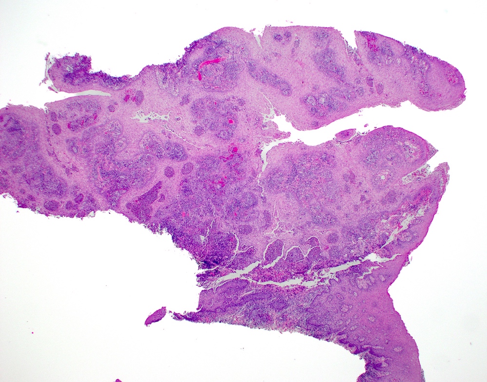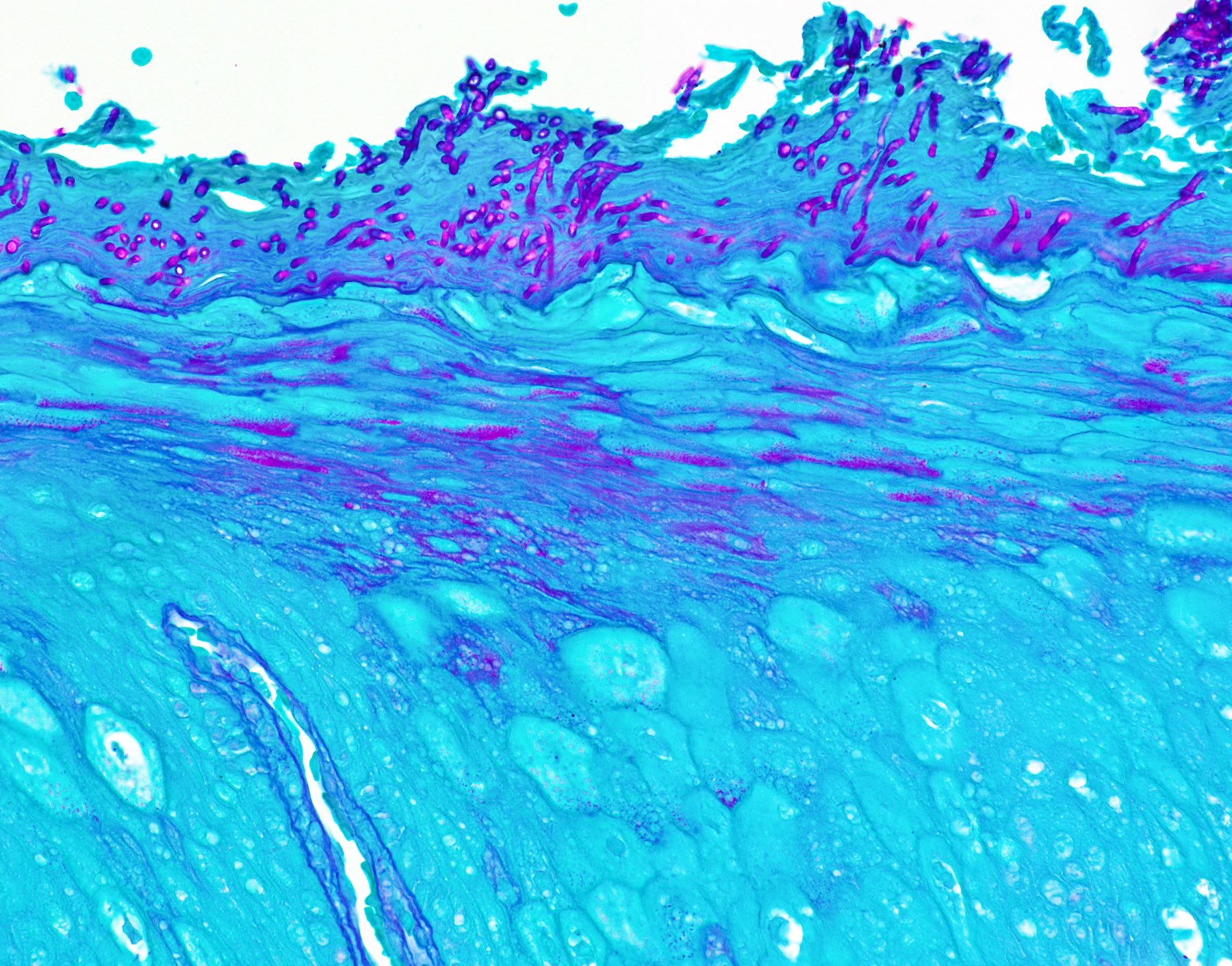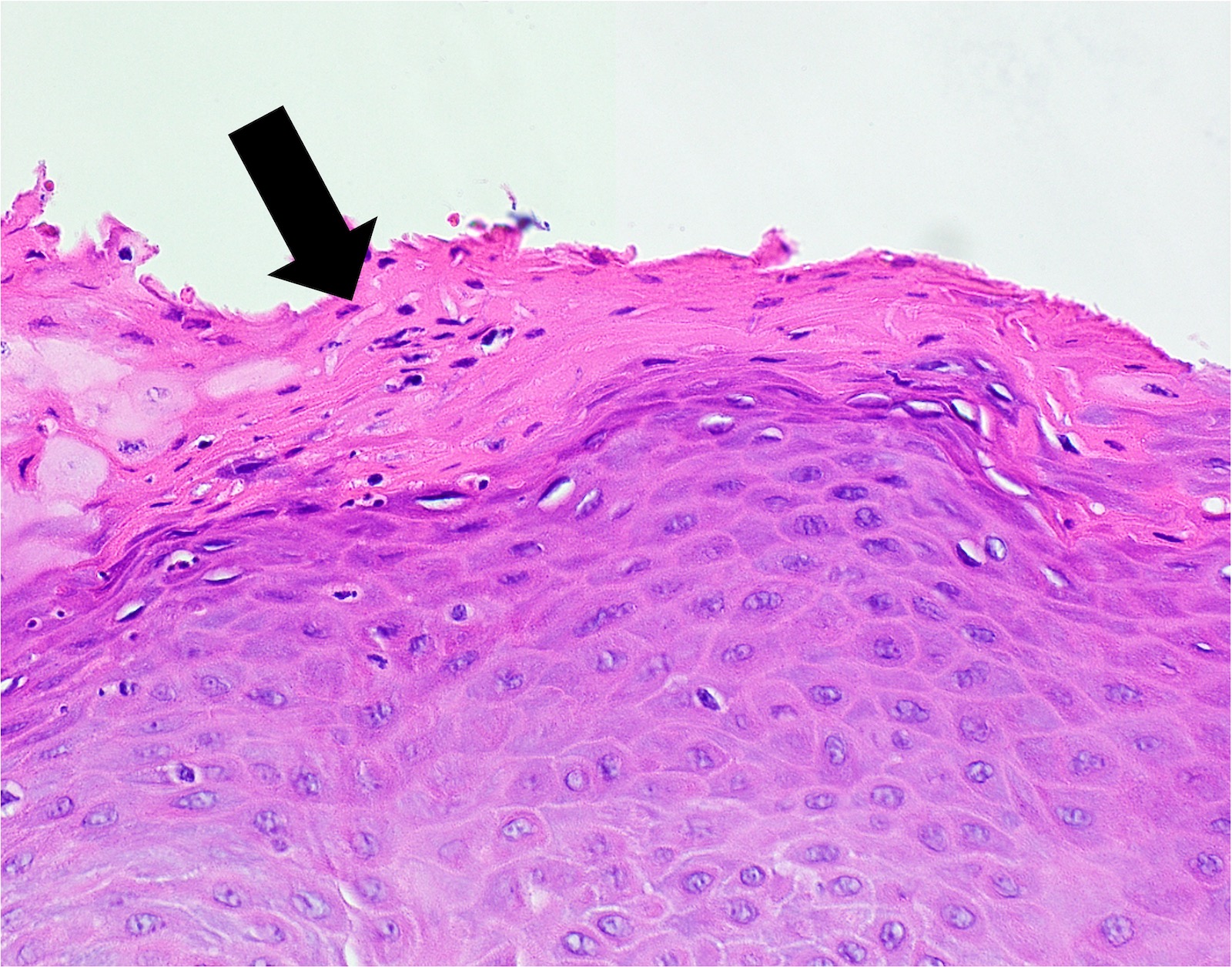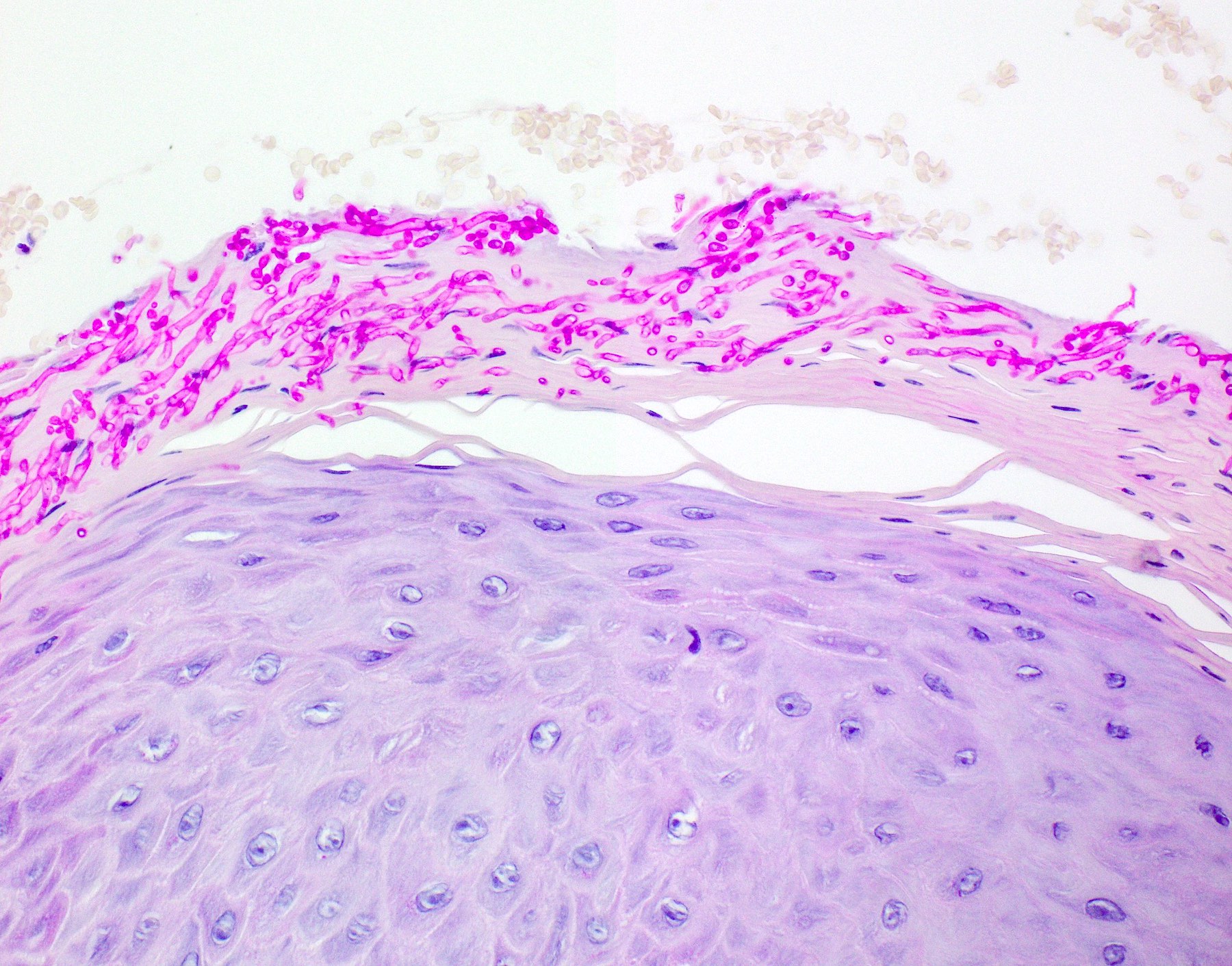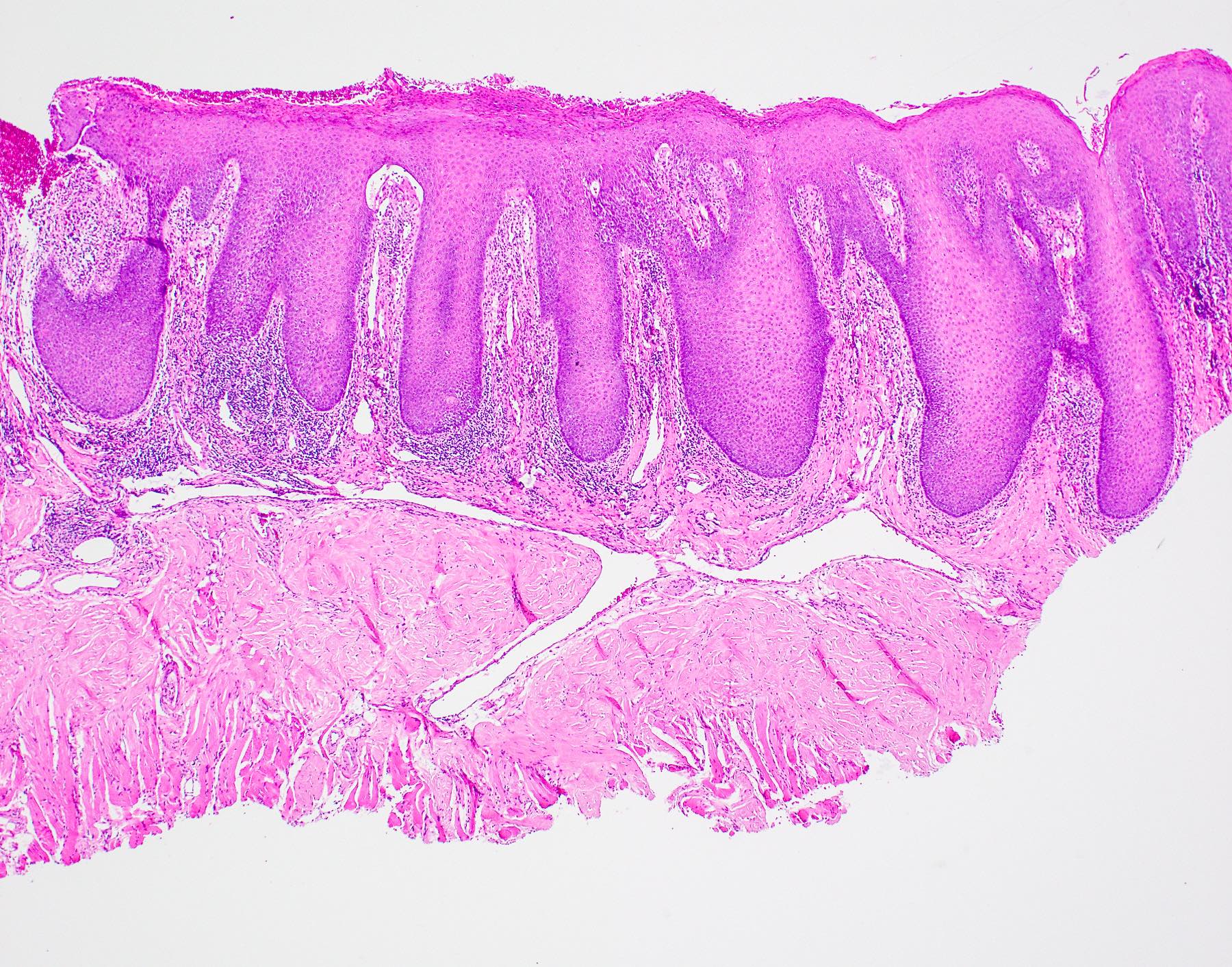 - Comment: The microscopic pattern of epithelial hyperplasia is suggestive of pseudoepitheliomatous hyperplasia, likely caused by the presence of candidiasis. If lesional tissue persists after adequate antifungal therapy, however, rebiopsy is recommended in order to rule out atypical epithelial processes that may mimic pseudoepitheliomatous hyperplasia.