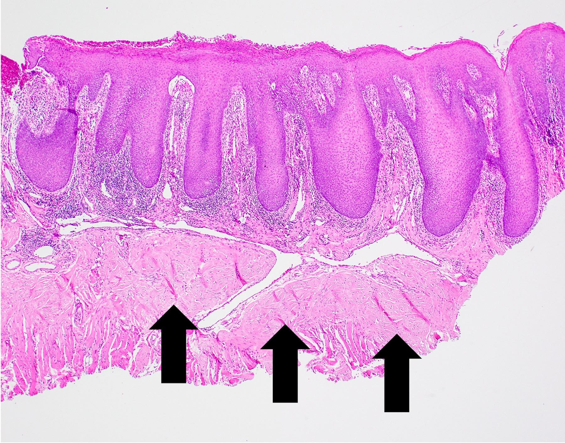 - Broad, bulbous, plunging rete ridges that demonstrate pushing encroachment on muscle or other deep submucosal structures, below the level of intact normal epithelium (Head Neck Pathol 2021;15:572)