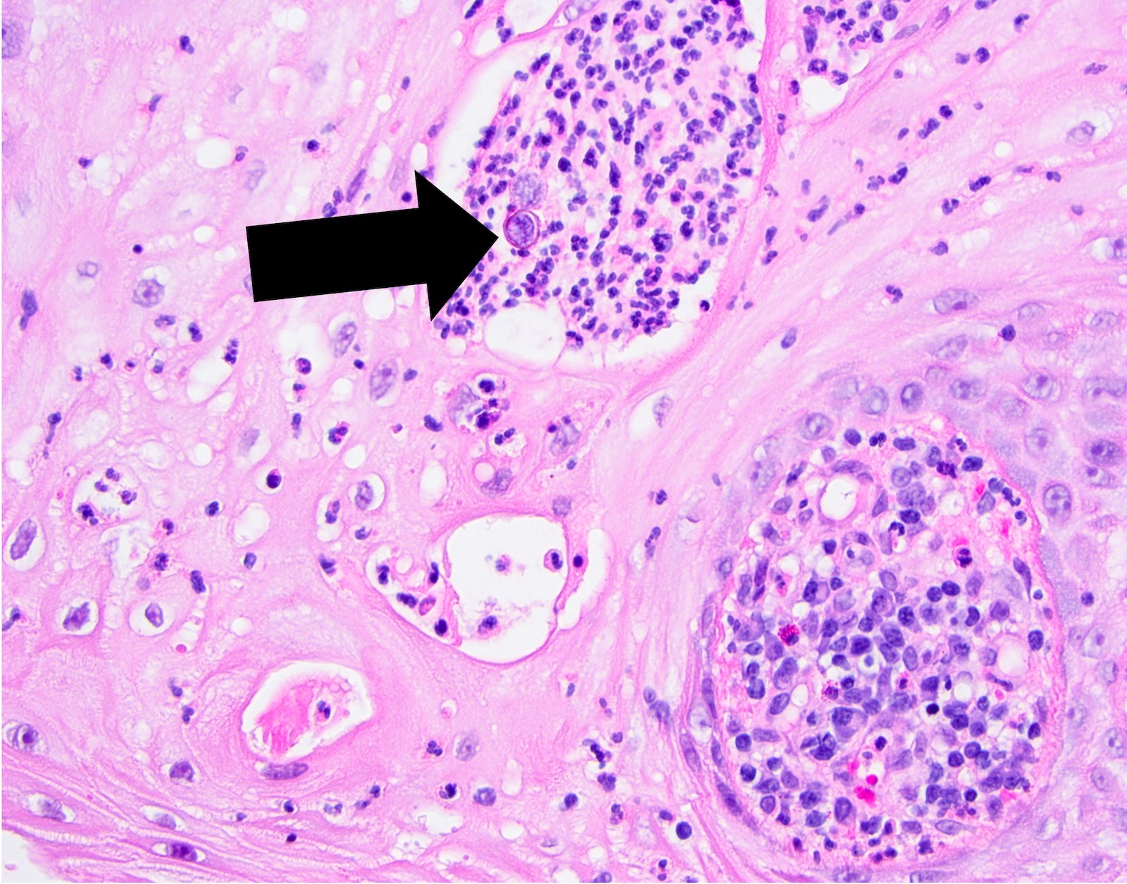 - Seen in a variety of conditions / tumors, namely granular cell tumor, candidiasis (median rhomboid glossitis, chronic hyperplastic candidiasis), necrotizing sialometaplasia, blastomycosis, granulomatosis with polyangiitis, etc. (Oral Dis 2020;26:573)