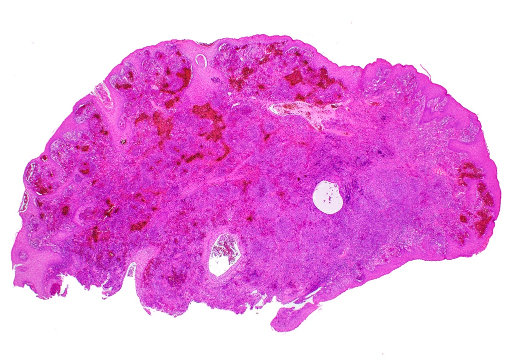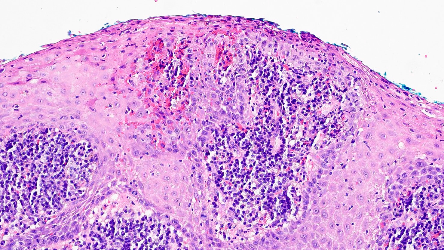 - Replacement of underlying fibrous stroma with sheets of pale, basophilic, plump granular cells suggests that the overlying epithelial proliferation is likely associated with granular cell tumor