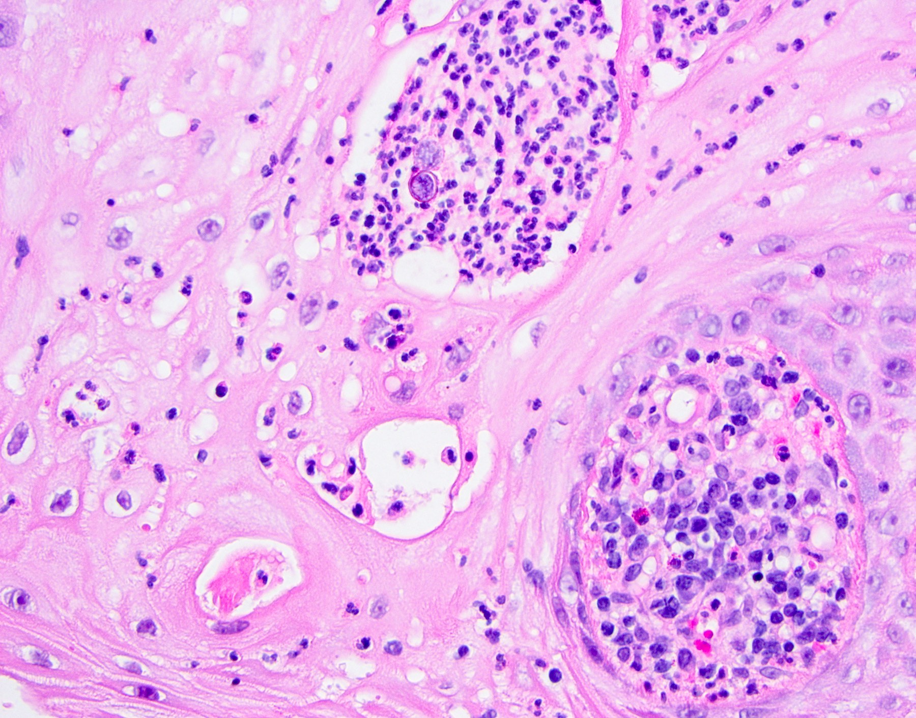 - Prominent leukocytic exocytosis or extravasated red blood cells should alert the pathologist to look for infection (candidiasis, blastomycosis, etc.) or granulomatosis with polyangiitis (Am J Dermatopathol 2011;33:112)