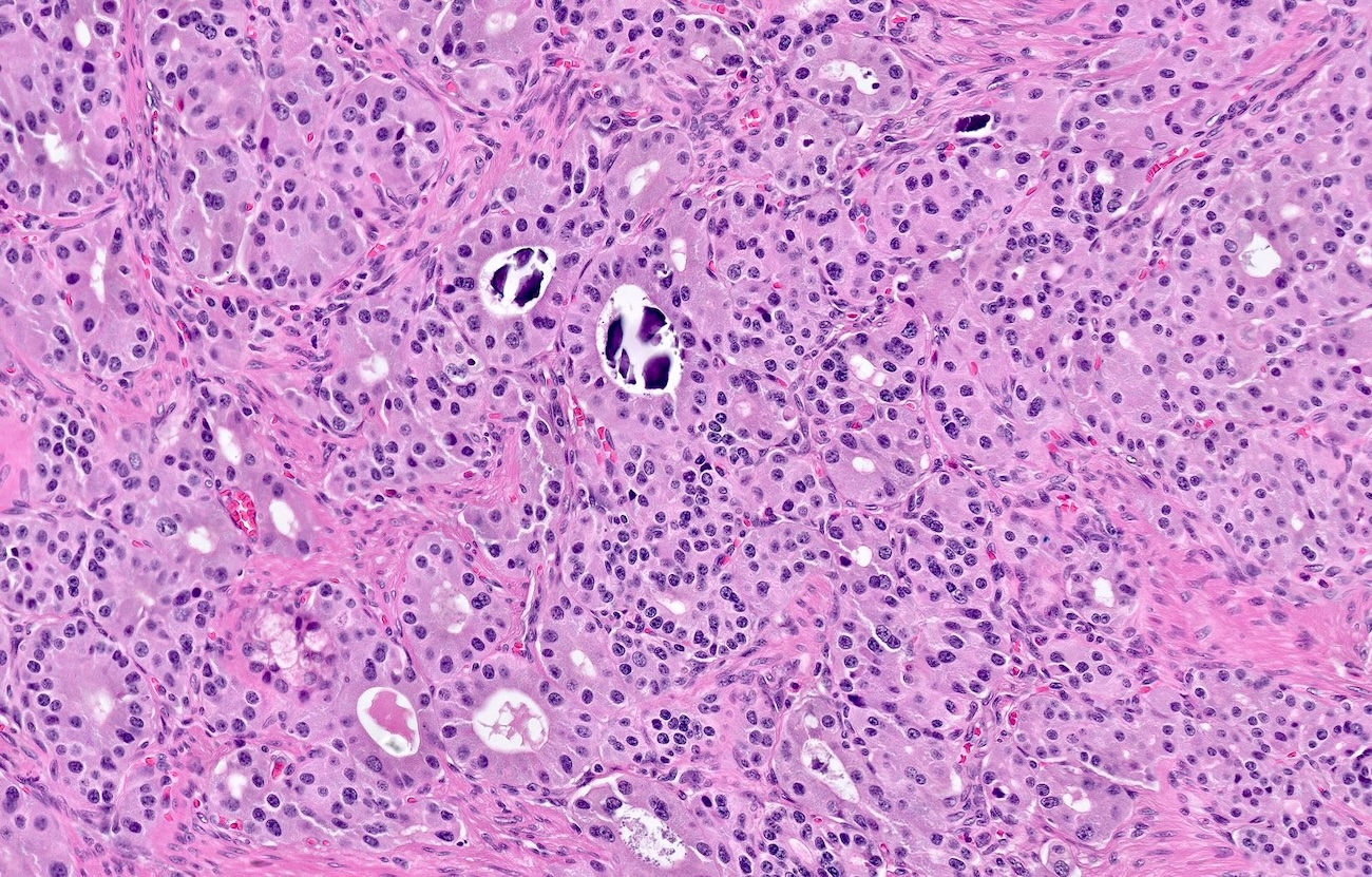 - Increased oxyphil cells in some cases (Histopathology 1992;20:305, Surg Pathol Clin 2019;12:1007)
