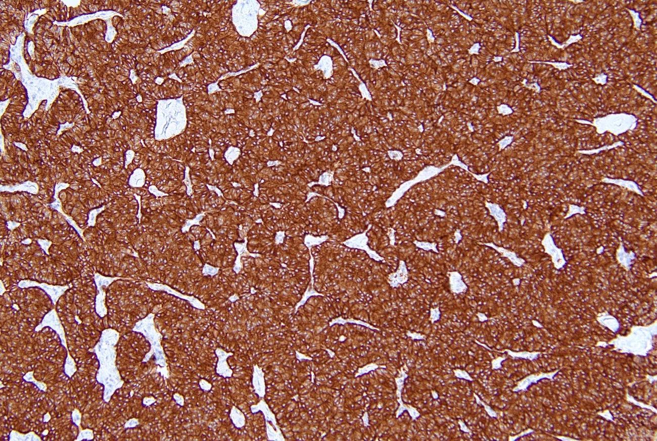 - Composed of monomorphic polygonal cells arranged in nests, trabeculae or diffuse sheets (Am J Surg Pathol 2008;32:534)