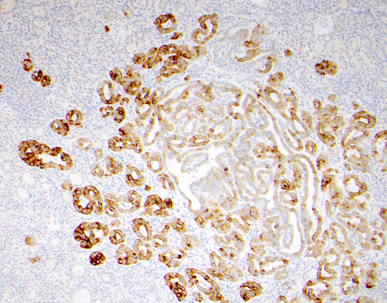 - Typically does not stain prostatic adenocarcinoma cells but does stain prostatic adenoid cystic / basal carcinoma and tumors with squamous differentiation (Am J Surg Pathol 2003;27:1523, Am J Surg Pathol 2004;28:651)