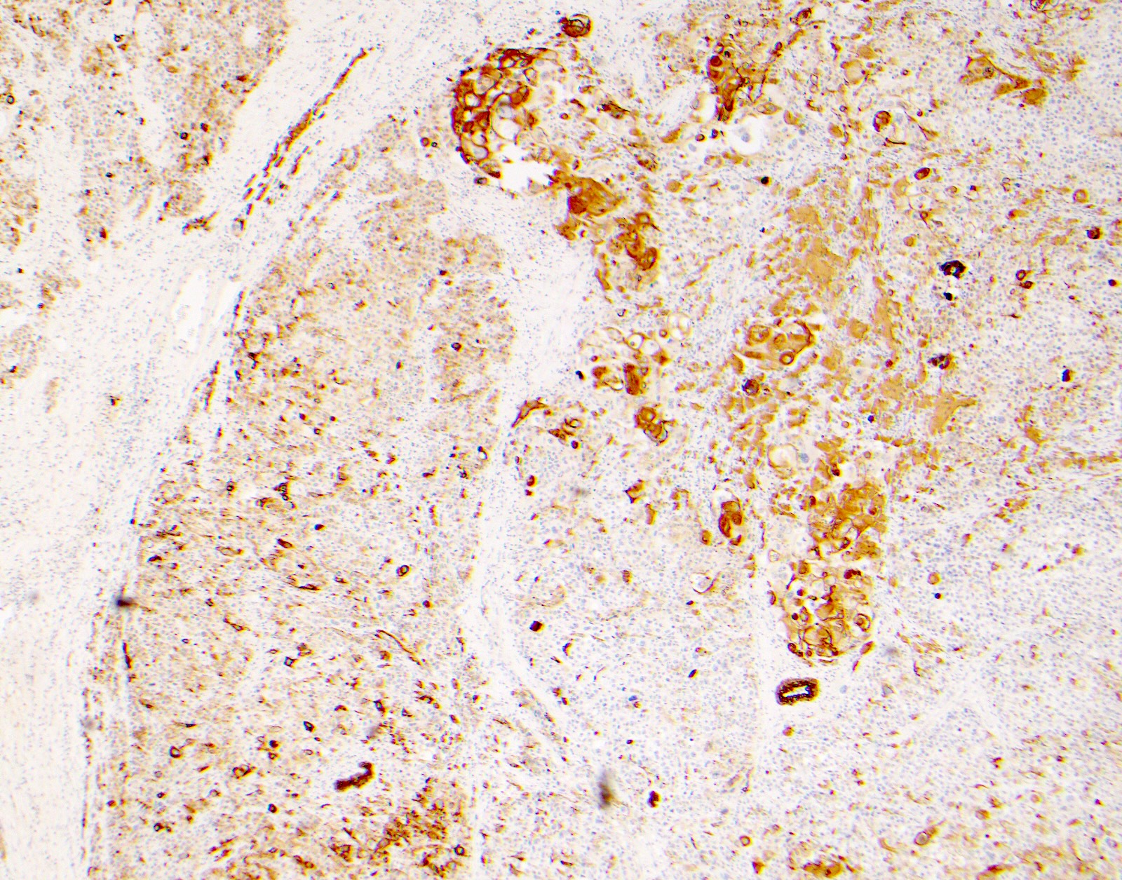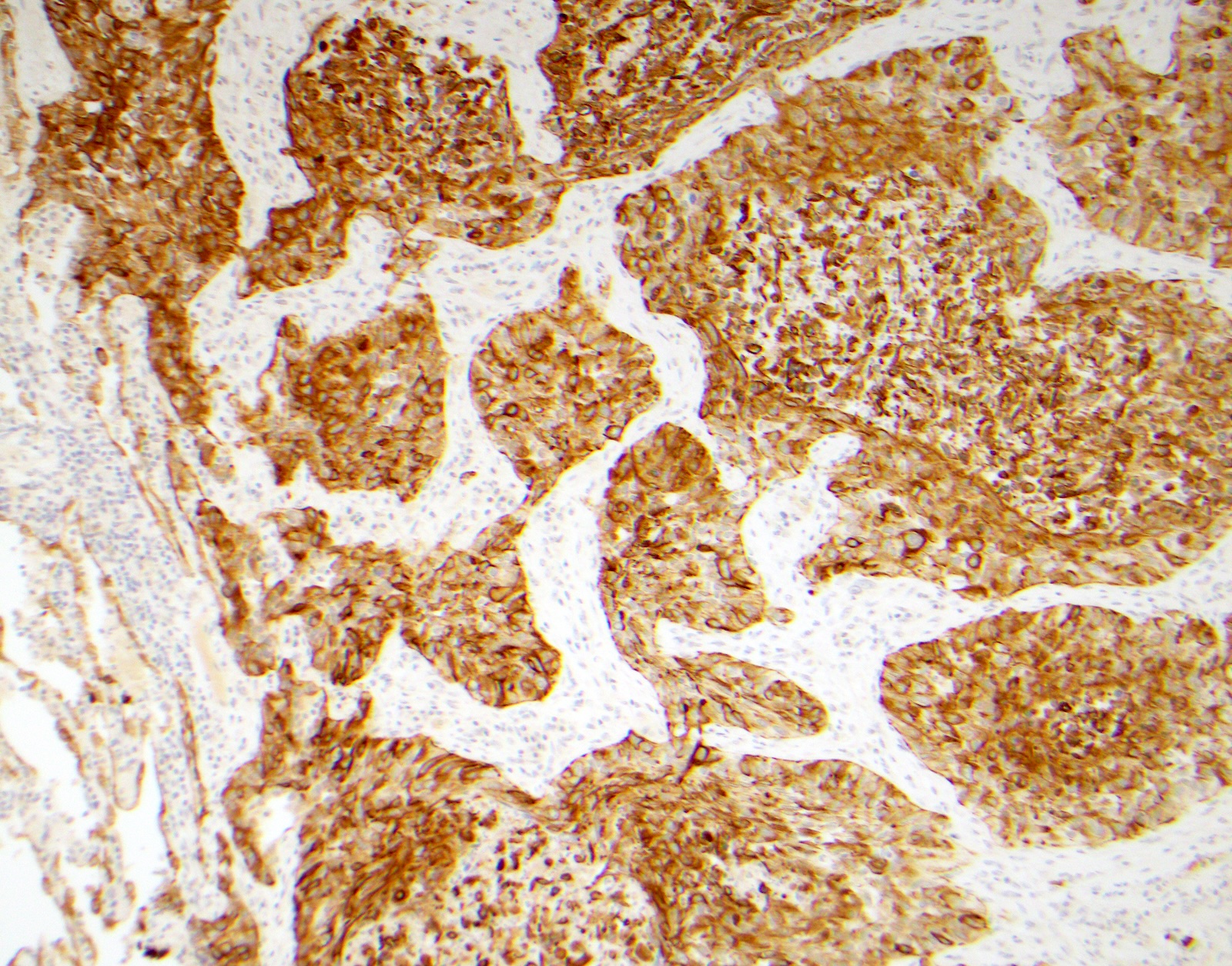 - Squamous cell carcinoma (100%) with cytoplasmic staining (Diagn Cytopathol 2008;36:20)