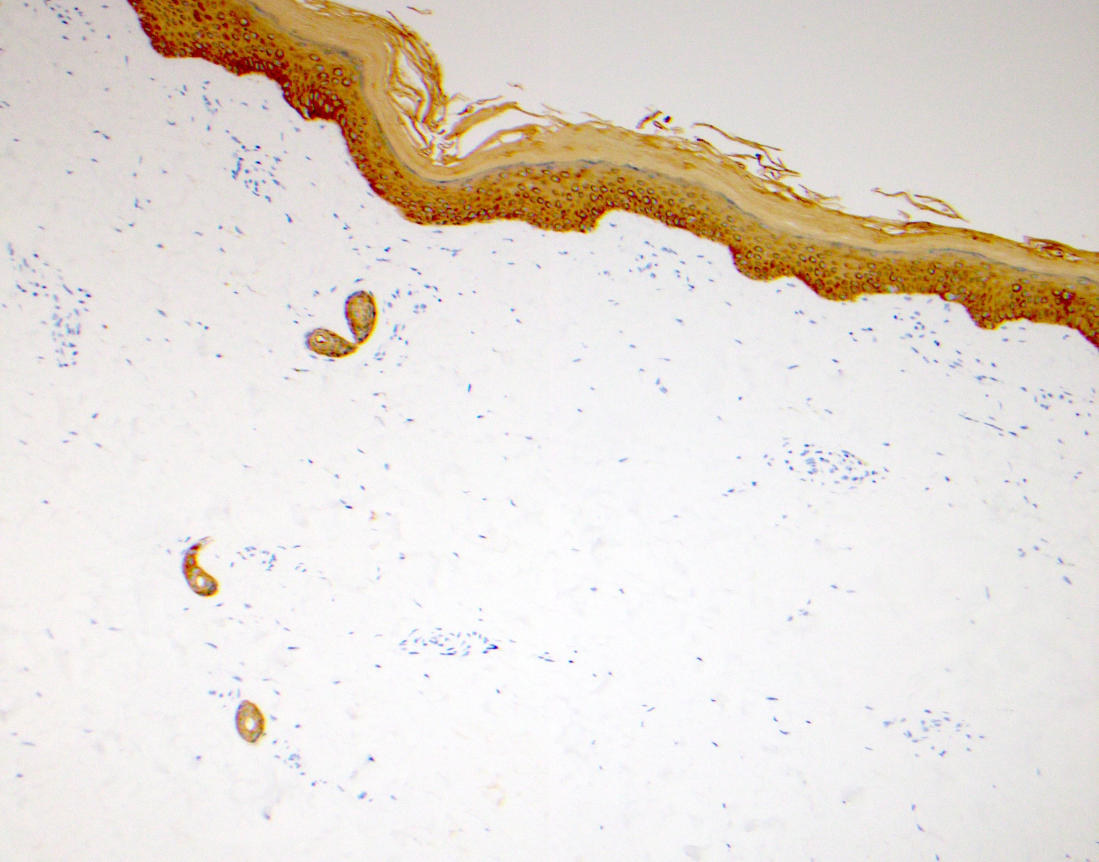 - Antibody specific for high molecular weight cytokeratins 1, 5, 10 and 14, which are found in complex epithelia