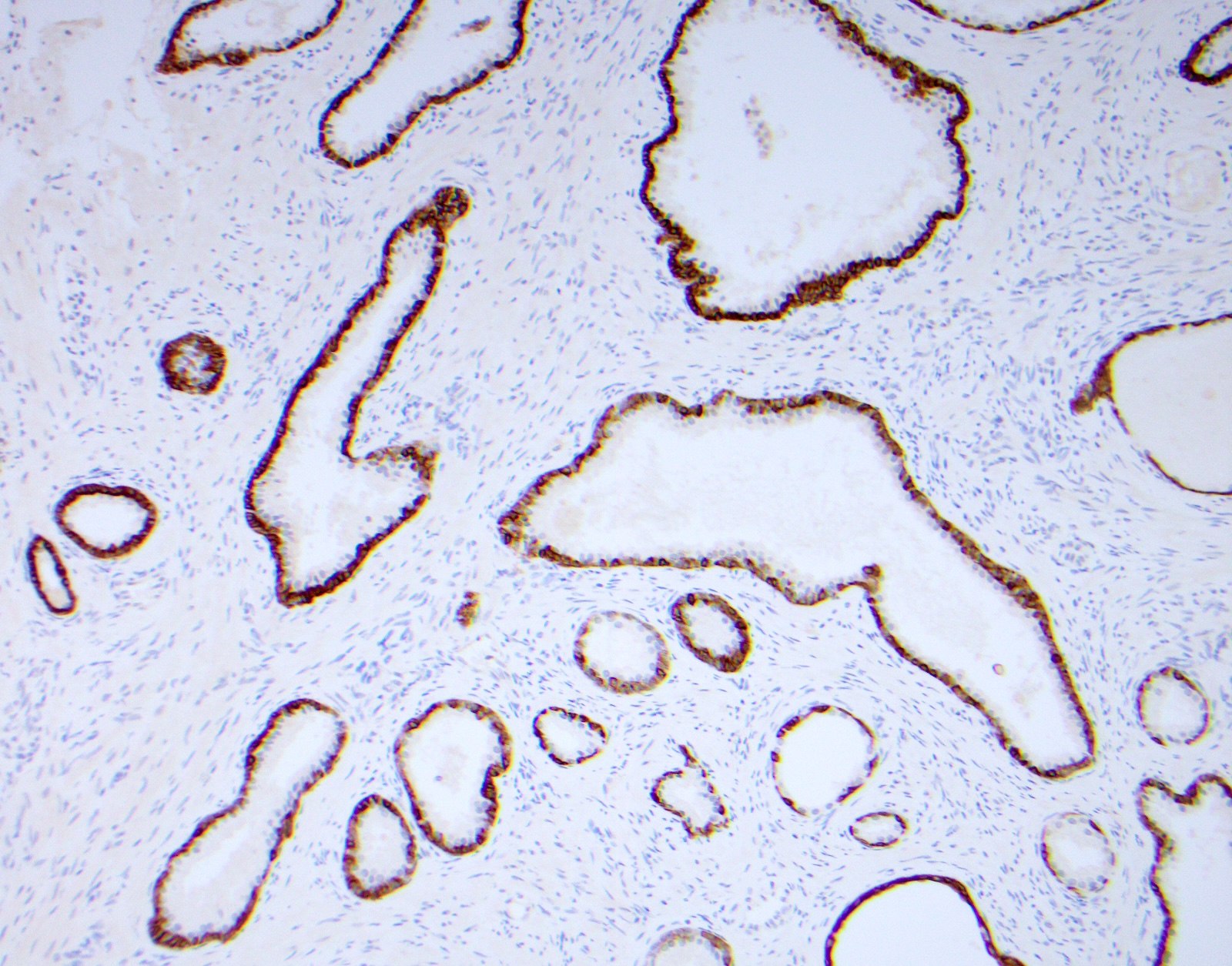 - Stains prostatic basal cells, even after destaining H&E slides, whose presence rules out usual type prostatic adenocarcinoma (Hum Pathol 2000;31:1155)
