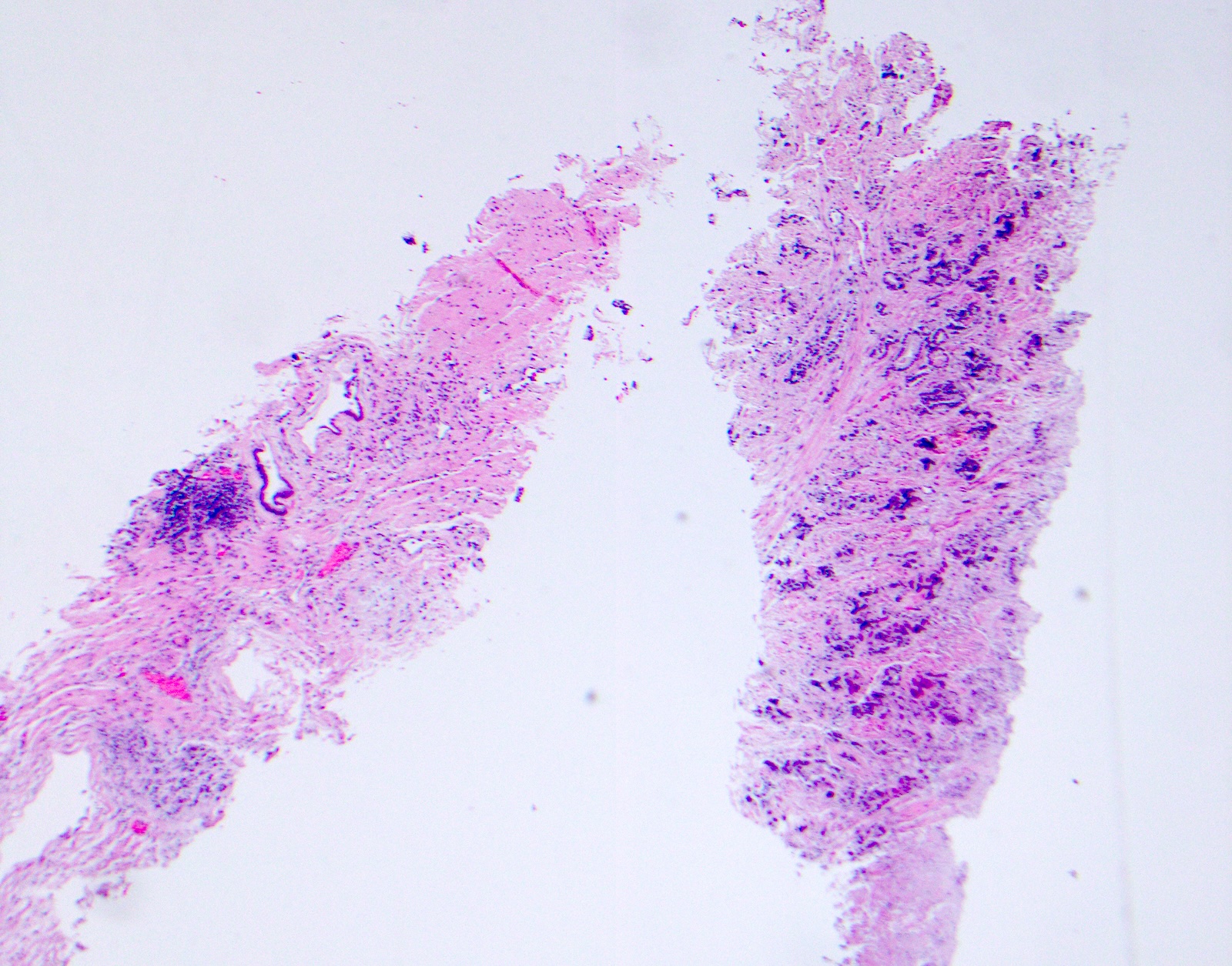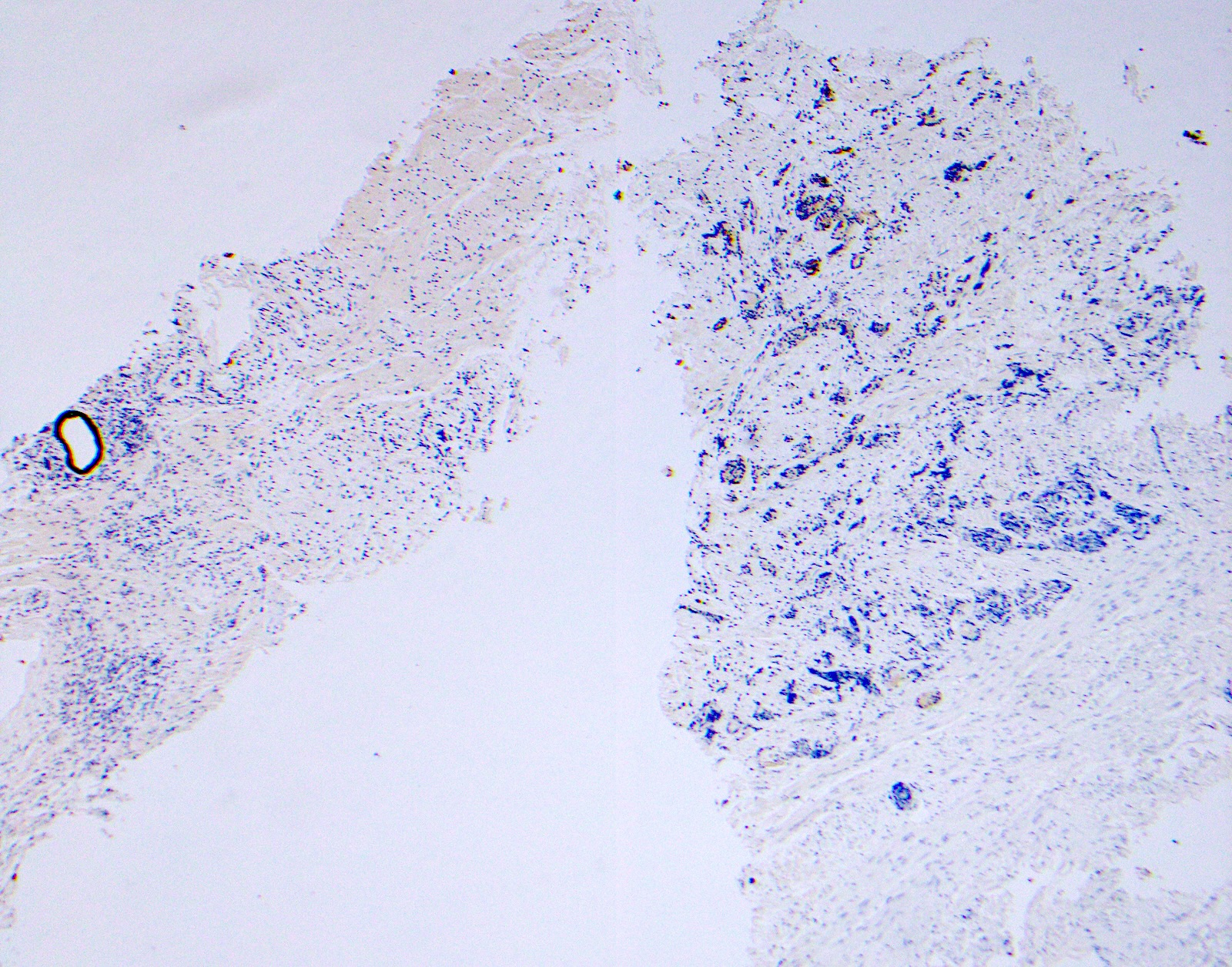 - Comment: Immunohistochemical stain for CK34βE12 (HMWK) highlights the basal cells in all the cores and confirms the diagnosis.